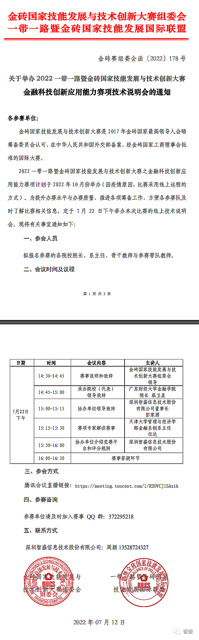 2022一帶一路暨金磚國家技能發(fā)展與技術(shù)創(chuàng)新大賽之金融科技創(chuàng)新應(yīng)用能力賽項(xiàng)計(jì)劃于2022年10月份舉辦(因疫情原因,比賽采用線上遠(yuǎn)程的方式)。為提升辦賽水平與辦賽質(zhì)量、推進(jìn)各項(xiàng)籌備工作、方便各參賽隊(duì)及時了解比賽相關(guān)信息,定于 7月 22 日下午舉辦本次比賽的線上技術(shù)說明會。