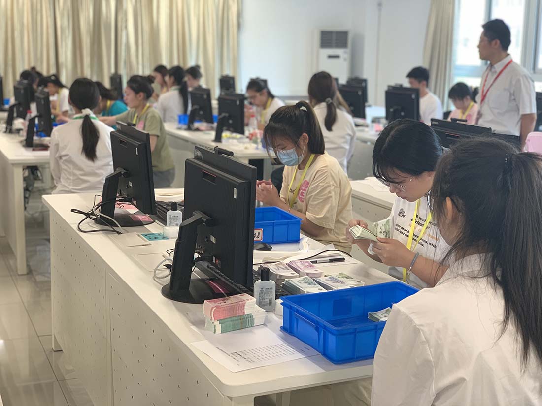大賽分業(yè)務(wù)素養(yǎng)、業(yè)務(wù)技能、銀行核心業(yè)務(wù)崗位操作和數(shù)字金融業(yè)務(wù)操作四個(gè)賽項(xiàng),其中業(yè)務(wù)素養(yǎng)”主要考核選手對經(jīng)濟(jì)金融相關(guān)基礎(chǔ)知識的掌握情況?!皹I(yè)務(wù)技能”主要考核選手對金融基本技能的掌握能力,包括傳票算、字符錄入、手工點(diǎn)鈔、貨幣識假等四個(gè)單項(xiàng)?!般y行核心業(yè)務(wù)崗位操作”主要考核選手對柜面業(yè)務(wù)處理流程及規(guī)范的掌握?!皵?shù)字金融業(yè)務(wù)操作”考核選手對大數(shù)據(jù)金融的分析與應(yīng)用處理能力,量化金融的綜合能力和區(qū)塊鏈金融中不同應(yīng)用場景工作崗位的專業(yè)技能。