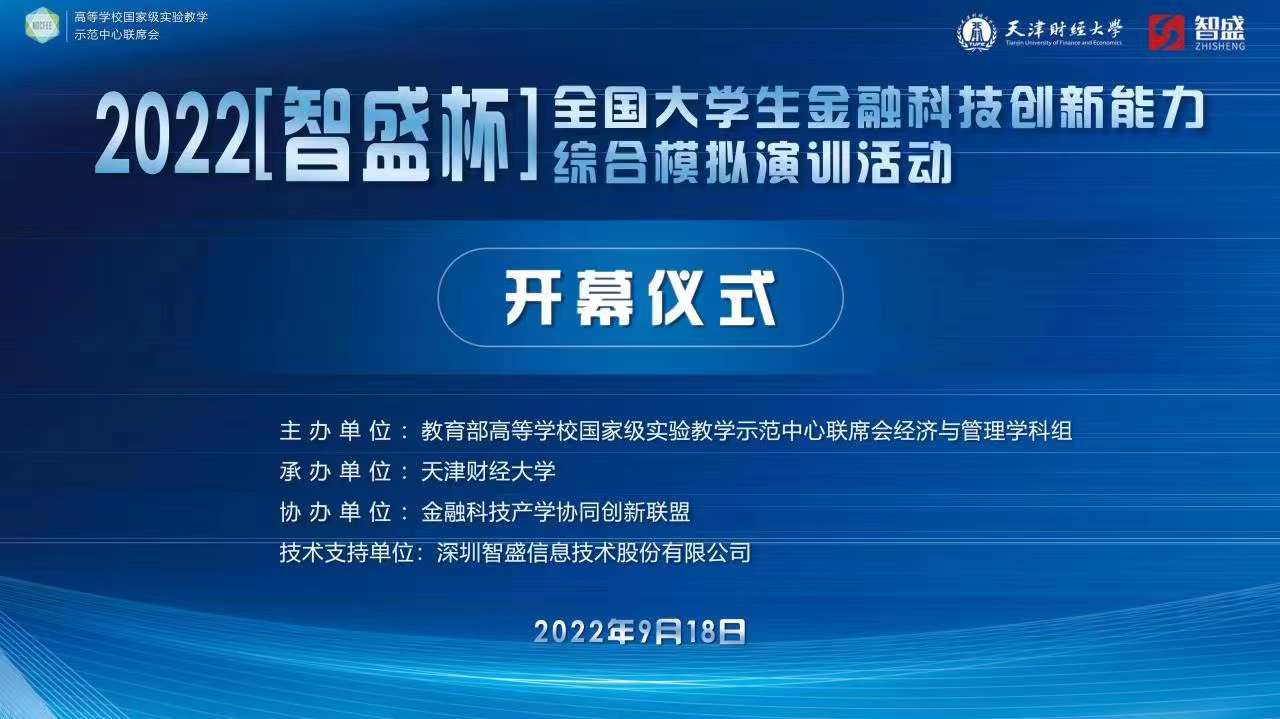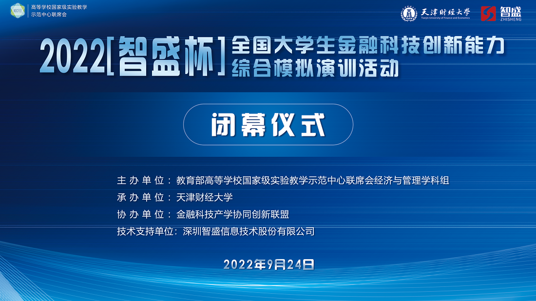 2022年9月18日,由教育部高等學(xué)校國家級實(shí)驗(yàn)教學(xué)示范中心聯(lián)席會(huì)經(jīng)濟(jì)與管理學(xué)科組主辦;天津財(cái)經(jīng)大學(xué)承辦;金融科技產(chǎn)學(xué)協(xié)同創(chuàng)新聯(lián)盟協(xié)辦;深圳智盛信息技術(shù)股份有限公司作為技術(shù)支持的2022 年“智盛杯”全國大學(xué)生金融科技創(chuàng)新能力綜合模擬演訓(xùn)活動(dòng)常規(guī)賽道全國總決賽正式收官。共有來自全國64所本科院校,64支參賽隊(duì)伍共256名選手參與角逐!