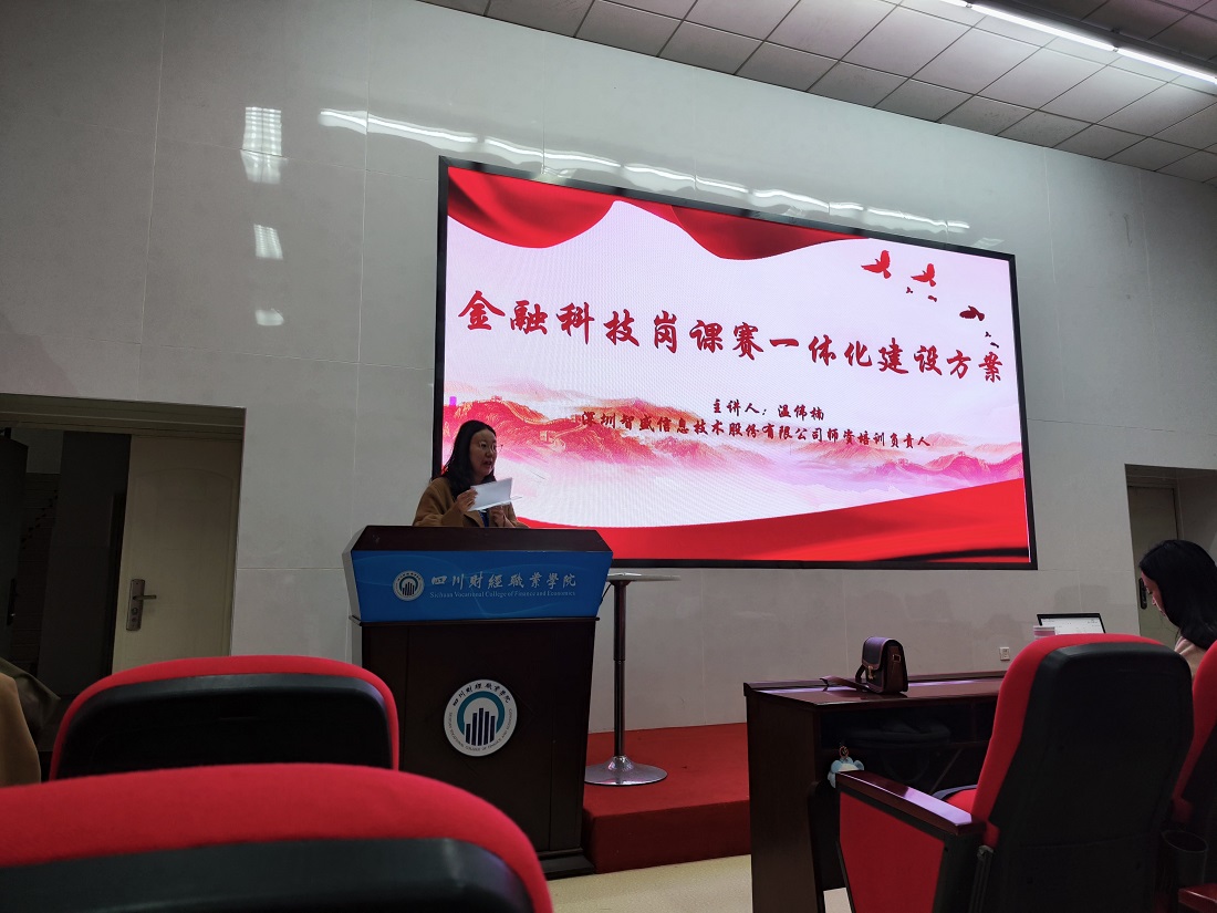 我司(深圳智盛信息技術股份有限公司)師資培訓負責人溫偉楠開展金融科技應用教學訓創(chuàng)一體化建設方案講座。講師溫偉楠主要從“銀行業(yè)務綜合技能賽項的發(fā)展歷程”“金融科技應用教學訓創(chuàng)一體化建設思路”兩個方面分別做出分享。